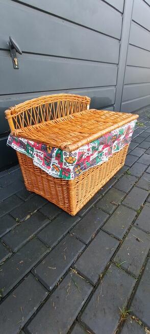 Sprzedam solidny kosz wiklinowy z klapą i kolorową materiałową wyściółką. Idealny na zabawki, koce, drobiazgi, jako ...